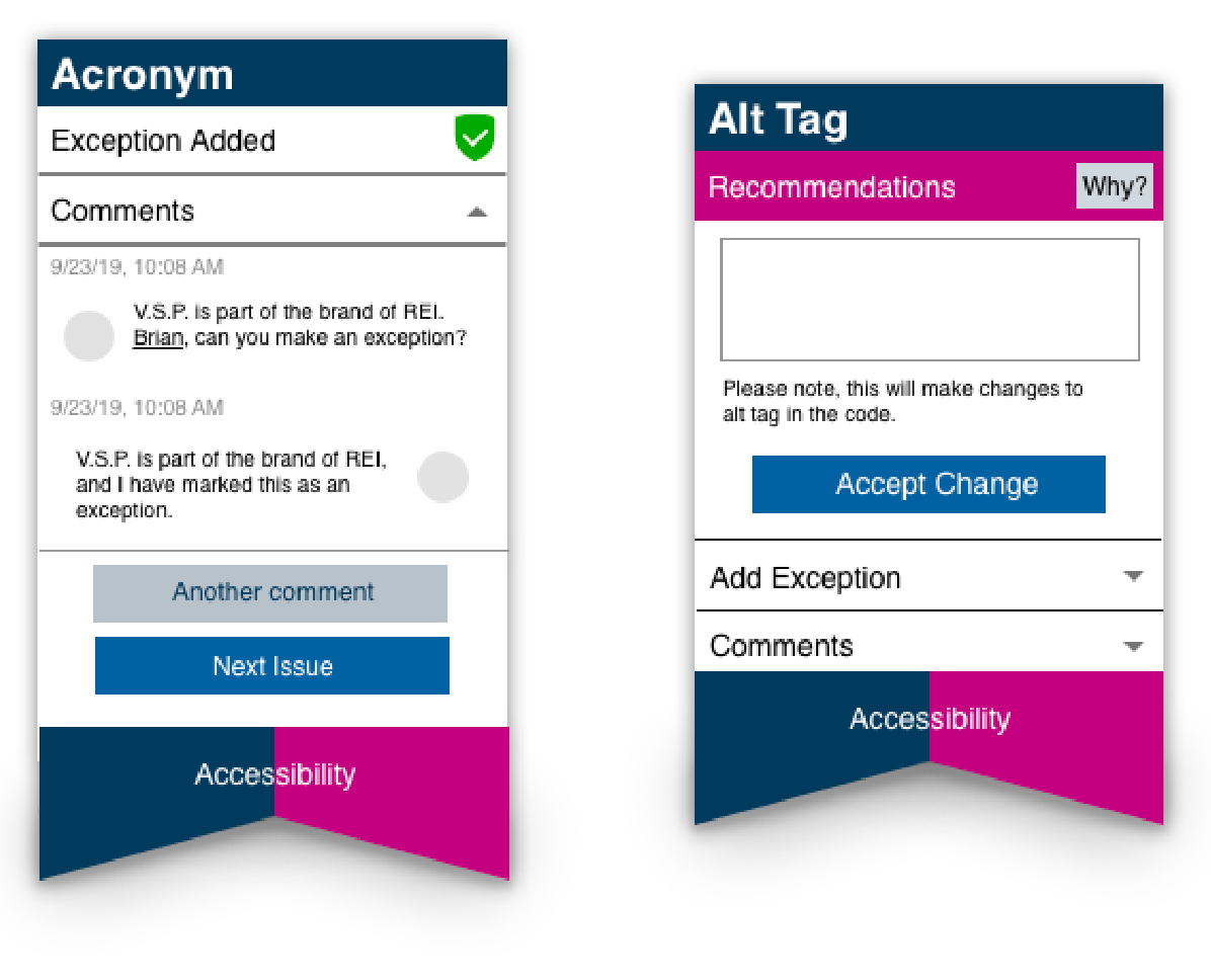 We knew, however, that not all of the potential quality control was that straight forward. In some cases individuals would need to add exceptions that might be brand specific. The exception would also illustrate the ability to add comments. Something else that we had to consider were issues that resided deeper in the website, such as an alt tag. You can see that there is a field to enter metadata and a disclaimer that this will make changes to the code.