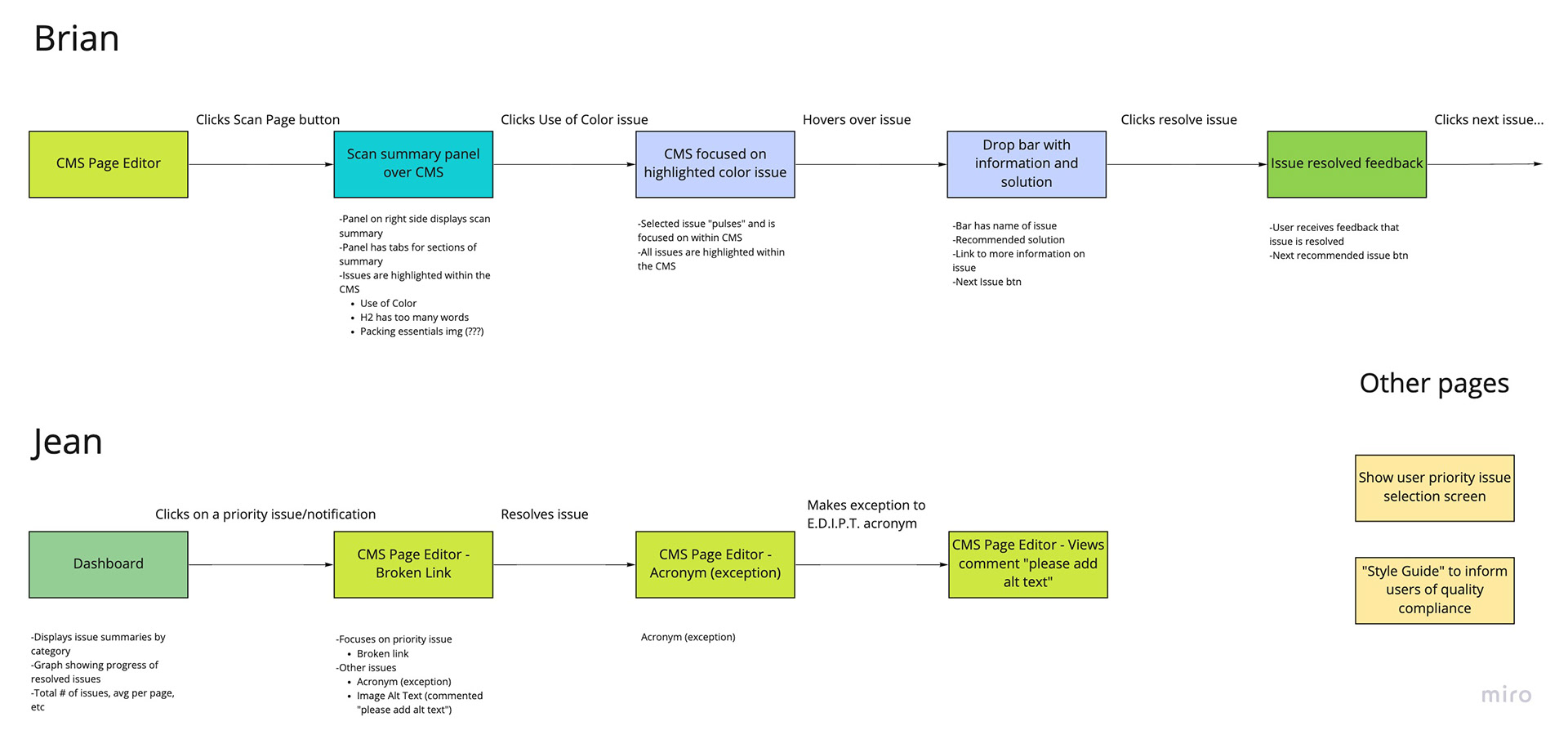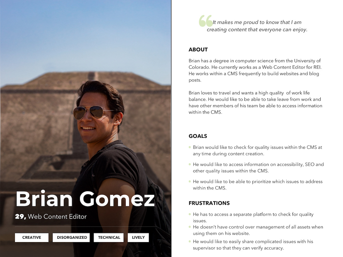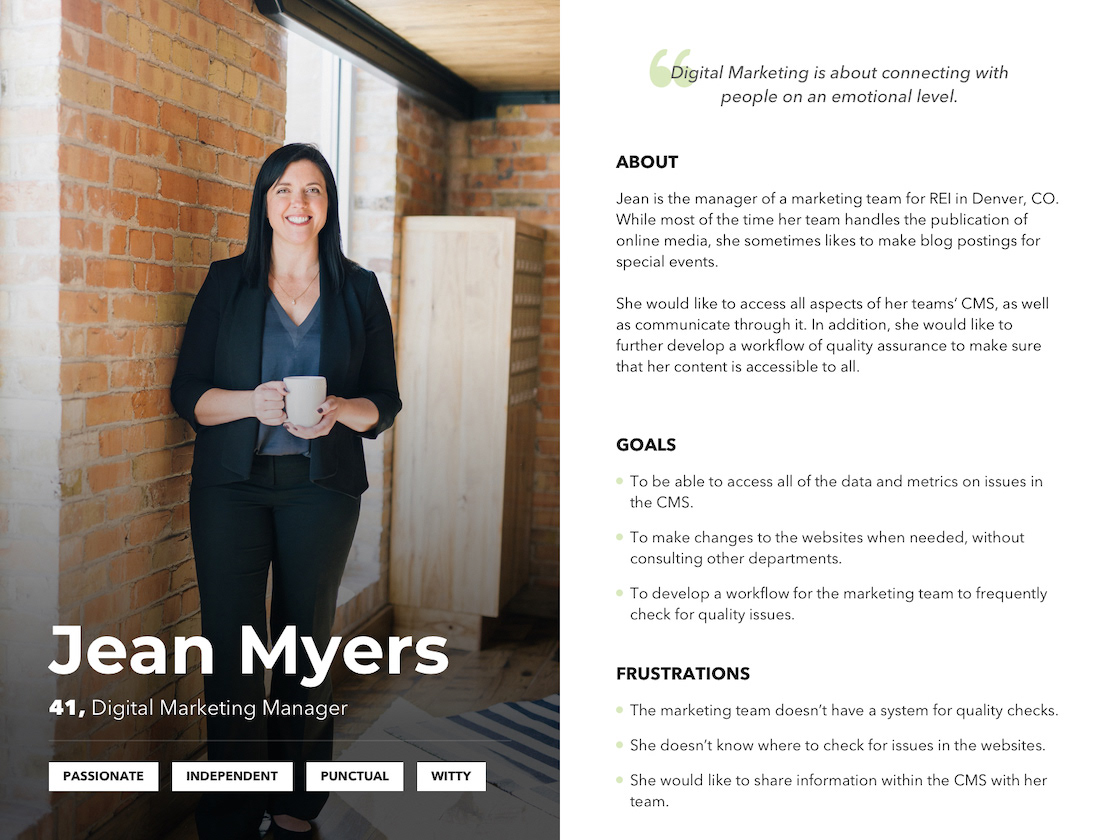 To help guide ourselves through these workspaces, we needed personas with realistic goals. Brian and Jean are coworkers in the digital marketing field work with the DXM and DQM in different ways. Brian has his hands in the CMS daily and needs an efficient way to check for quality issues. Jean is the manager of her team and requires access to metrics on quality, while still making certain changes to her teams content.